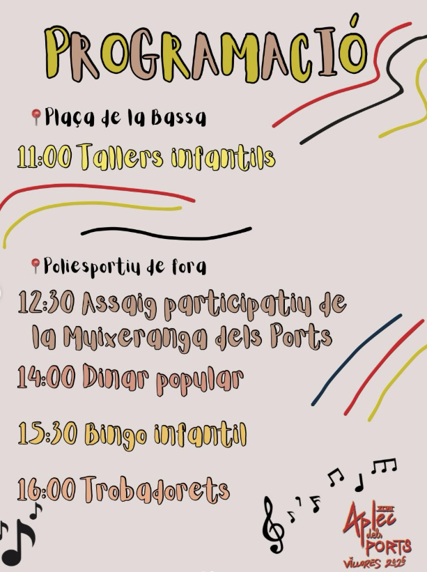 El 16 de maig, Villores acull una nova edició de l’Aplequet dels Ports, una jornada pensada per a celebrar la cultura, la germanor i la vida comarcal en un ambient festiu i familiar. Al llarg del dia hi haurà propostes per a totes les edats: tallers infantils, un assaig participatiu de la Muixeranga dels Ports, dinar popular amb activitats per als més menuts i música en directe amb Trobadorets. Una cita per retrobar-nos, fer comarca i gaudir plegats d’un dia ple de convivència i tradició. Enguany, a més, el cartell és obra d’una alumna del CRA Els Ports – Aulari de La Mata, un detall que reforça l’esperit col·lectiu i educatiu de l’Aplequet.