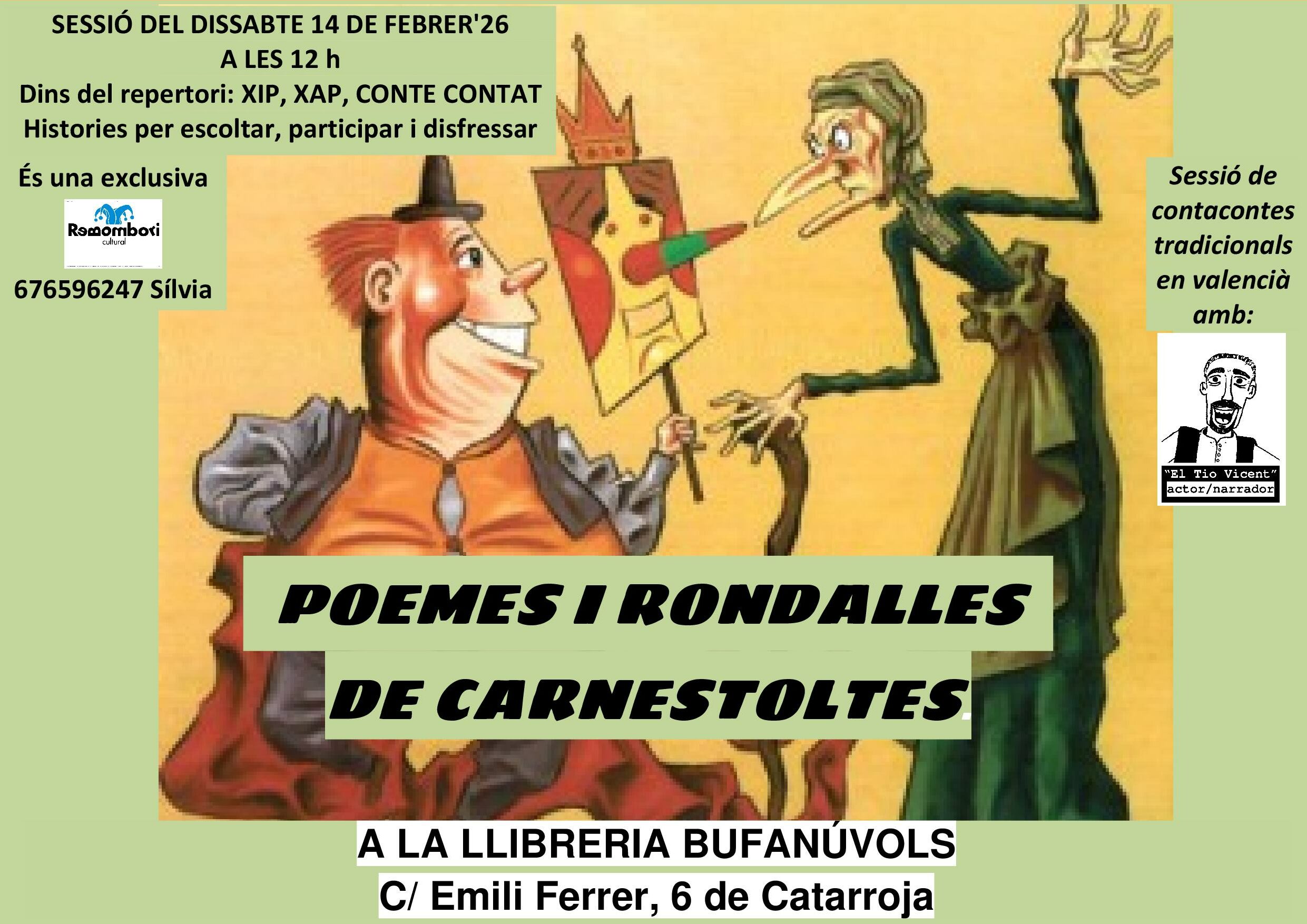 Dins del repertori Xip, Xap, conte contat, el Tio Vicent, artista veterà en l’escena de la narració oral valenciana, ens convida a un viatge vibrant de paraules i emocions. A través de contes plens d’aventures, ritmes i sorpresa, xiquets i xiquetes es submergeixen en històries teixides amb màgia i proximitat, fent que cada rondalla desperte la imaginació i el somriure.