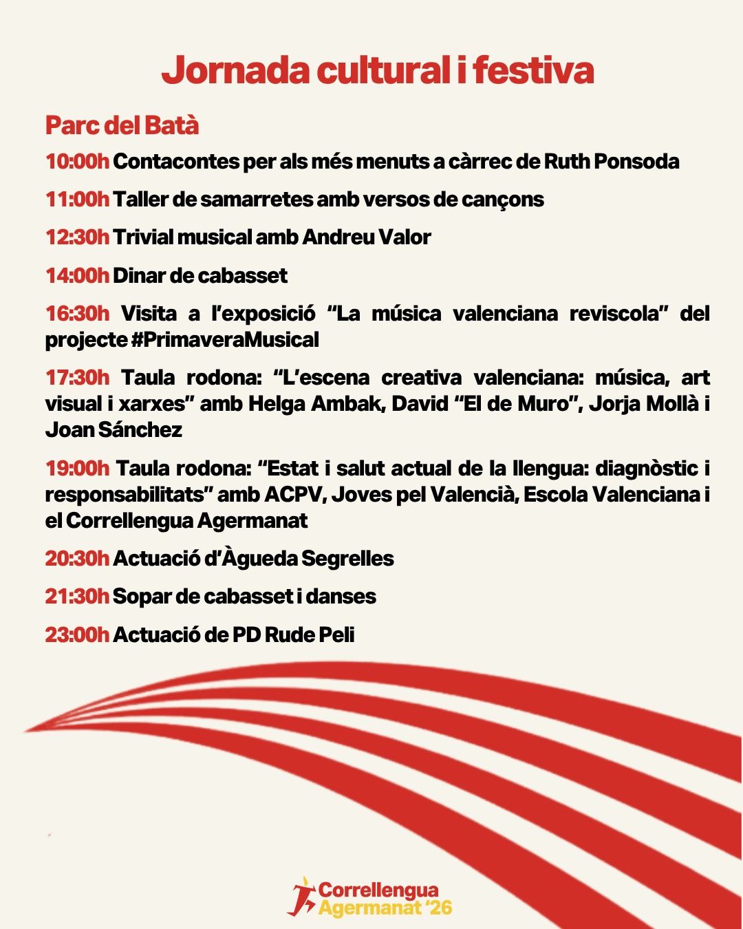 El Parc del Batà de Muro acollirà una jornada cultural i festiva en el marc del Correllengua Agermanat, pensada com un espai de reflexió, participació i celebració de la llengua. Al llarg del dia hi haurà activitats per a tots els públics: contacontes i tallers infantils, un trivial musical, espais de debat al voltant de la creació cultural valenciana i la situació actual de la llengua, així com exposicions, música en directe, sopar de cabasset i danses. Una proposta oberta i participativa que combina cultura, festa i compromís amb el valencià.