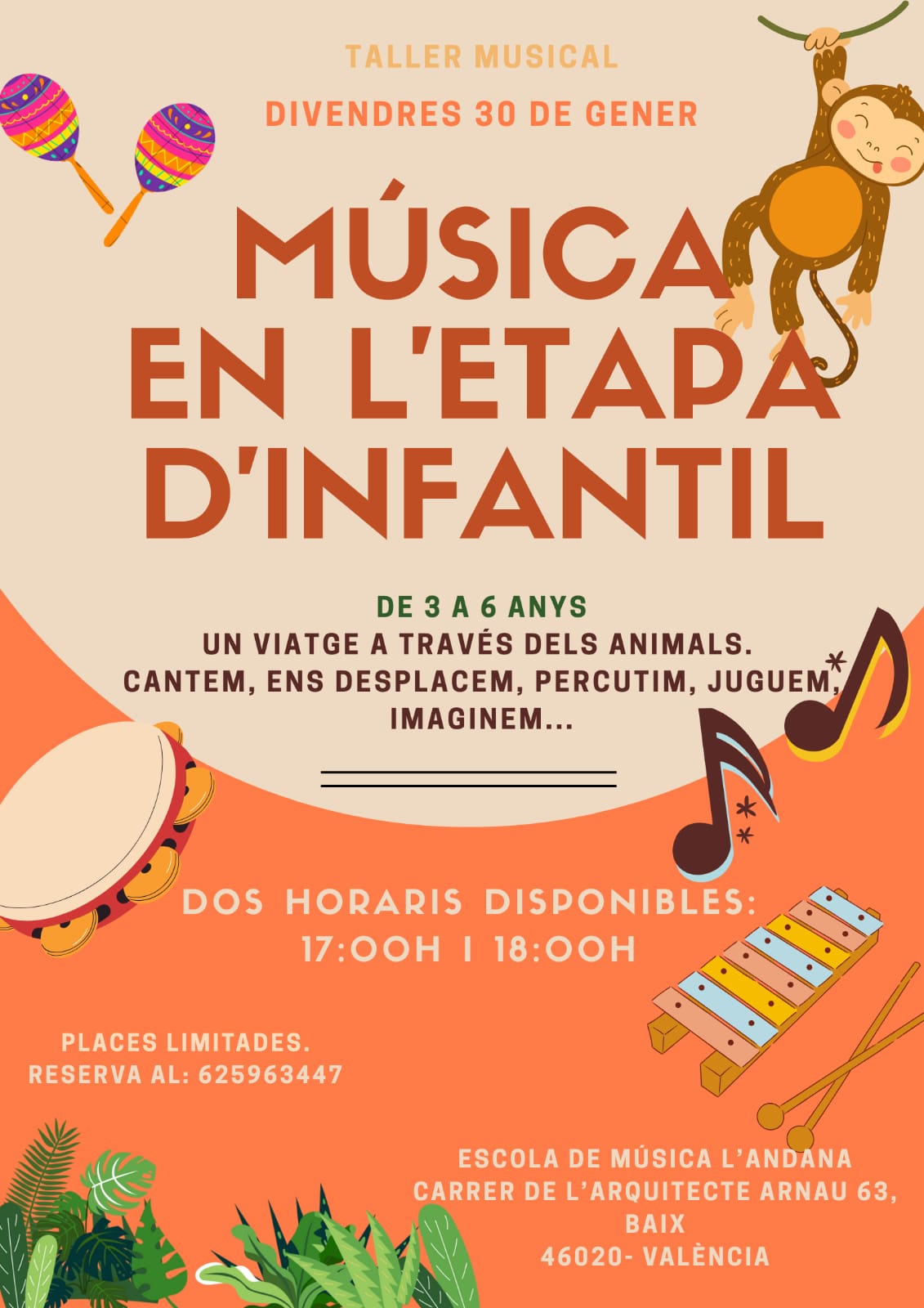 L’Andana Escola de Música convida les famílies a una vesprada plena de ritme, joc i descobriments musicals en aquest Taller de Música en Família, pensat perquè la xicalla i les famílies compartisquen una experiència sensorial i afectiva a través del so i el moviment. Amb instruments senzills, cançons, ritmes i activitats participatives, els menuts experimentaran la música de manera natural i lúdica, estimulant la coordinació, l’escolta, la memòria i el vincle emocional amb els seus adults de referència. Un espai acollidor, respectuós i creatiu on cada família podrà gaudir al seu ritme, descobrir noves propostes educatives i fomentar l’amor per la música des de ben menuts. Una activitat ideal per a compartir, créixer i vibrar junts.
